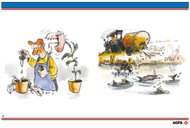 正如在I1化肥专题中已经讨论过的,正确使用化肥可以大规模提高产量,不会产生有害影响。但过度使用则会污染河流和地下水,危害环境。使用化肥时要根据需要仔细控制用量,并适当稀释。不加选择的使用会污染环境,例如:污染河流,这会伤害甚至使动物以及鸟类致死(在图I7中,畜牧业的废弃物可用 作土壤肥料。但是过度使用会污染河道,降低水的含氧量,造成鱼类死亡)。