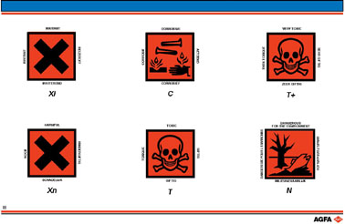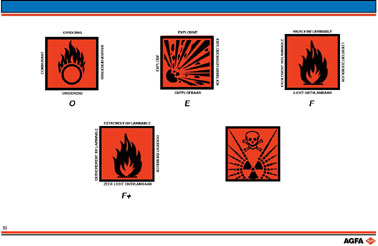 这些危险标志大多数都配有四种语言的警告文字。由于放射性标 志付印时还没有国际统一的规定, 所以缺少警告文字。下面对每个危险标志列举一个相应的例子: