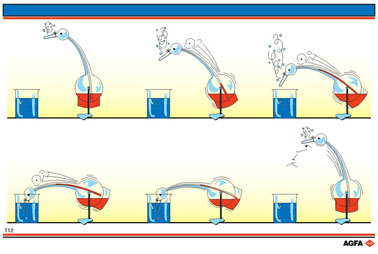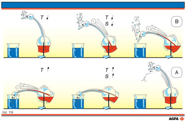 由于鸟的结构设计特点,当鸟向前弯腰时,连接管的下端脱离下方的液体,因此管中的液体流回底部球中。鸟的嘴巴再次弄湿引起温度升高,顶部玻璃球中的蒸气压增大。这样重心重新下降,鸟就直立起来。如果不把鸟“喝”水的烧杯移走,整个过程将会一直循环往复进行。图 T12 描述了整个过程。