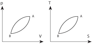 整个系统可看做从 A点(直立位置)到B点 (喝水位置)之间的循环。喝水鸟相当于一类发动机。pV 图中的封闭区域代表所做的功W ,而TS图中的封闭区域代表体系吸收的热量Q。注意:根据热力学第一定律,功与热相等,W = Q。