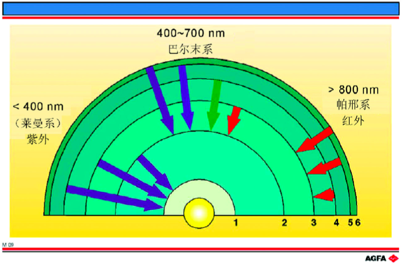 当m为1时,得到莱曼(Lyman)(紫外)系光谱线。m等于2时,算得上述巴尔末(可见)系光谱线。m等于3时,得到帕邢(Pashen)(红外)系光谱线。