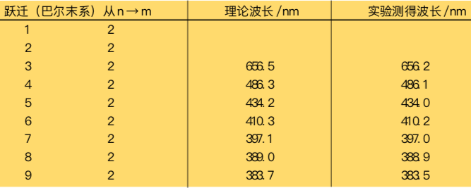 取里德堡常数为109 677.6 cm-1,由此算得氢的巴尔末线的波长,计算数据以及相应的实验数据列 于下表: