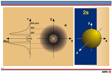 图M15的中间部分为电子云表示的截面图,两个高电子密度区域与径向概率分布图中的极大值相对应。 图M15的右边部分表示2s轨道的形状,对应一个界面,在该界面所包含的体积内,发现一个电子的机会为90%。