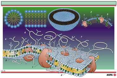 由于这种相互作用,可以形成胶束(图左)和双分子层(图中),也可以是球形的(图中右)。细胞膜是在类似这种亲水亲油性磷脂双分子层外构建起来的。两个水相,细胞内含物和细胞外液,是被非极性层(脂肪酸尾部)相互分开的,这些非极性层是由磷脂(2)和胆固醇(3)所形成的。而球形蛋白质(1)、含有一个螺旋状结构(5)和键合糖链(7)的糖蛋白(6),以及糖脂(4)则穿过这层非极性层突出来。