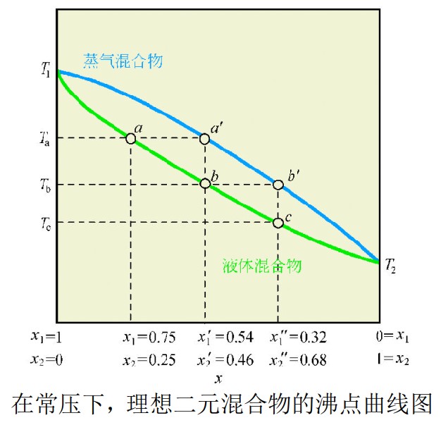 = 0.75) 、组分2的摩尔分数等于0.25 (X2 = 0.25) 的混合物在温度 Ta沸腾。 方的曲线表示液相的组成。对于我们讨论的混合物来说,曲线上的a点代表了这一点。与之对应的气相的组成是a’,两组分的摩尔分数分别是 X1’ = 0.54 以及