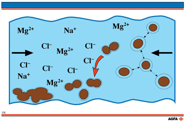 海水涌入会将一些离子带进河水,这些离子会降低颗粒相互间的斥力,从而使颗粒聚集形成沉淀。吸引力(重力)超过减弱了的排斥力,颗粒聚集在一起沉入河底。所以,如果不定期将河口的泥沙挖走,河口就会渐渐淤积,形成三角洲。 |