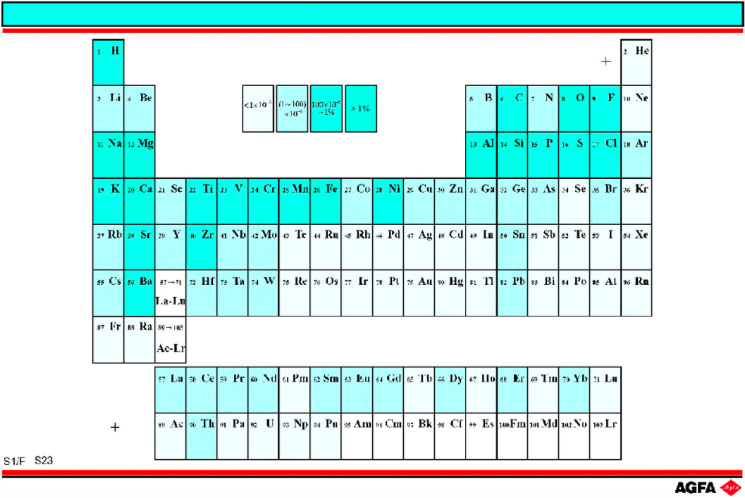 图S23中,不标颜色的格子代表地壳中不能天然存在的元素。由U和Th衰变产生的Po、At、Fr、Ra、Ac 和Pa只是微量存在。依据参考书目(1)Tc 的丰度小于 1 × 10-6,而并未将其标为无色。H、C、N、O、 F、P、S、Cl、Br、Rn、Rh、Te、I、S、Pt 和 Hg 的丰度值取自参考书目(2),稀有气体的丰度值取自参考书目(3)。补充符号可让学生课后在黑白本上着色。