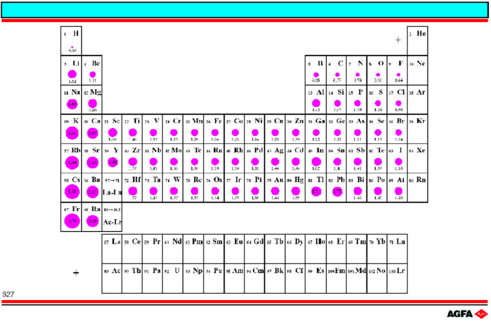 共价半径定义为:由共价单键连接的、两个相同原子的核中心距离的一半。图S27中表示的就是这种共价半径,单位为A(等于SI单位中的0.1nm)。用圆圈表示原子半径的相对大小[参考书目(1)]。 从图可以看出,原子半径在同一族中从上到下增大,而在同一周期中从左至右减小。参考书目: