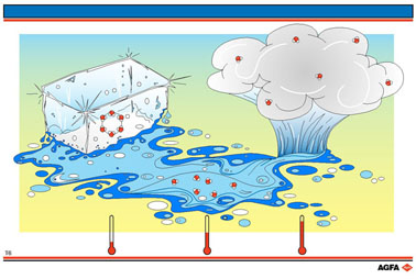 水以三种形态存在:固 体(冰),液体(水)和气体 (汽)。冰的结构十分有序,冰中的水分子都被相互限制在某一确定位置里,只能在其晶格 (晶格是对空间中周期性排列的点阵的称谓)周围轻微振动,即冰的混乱度很低。