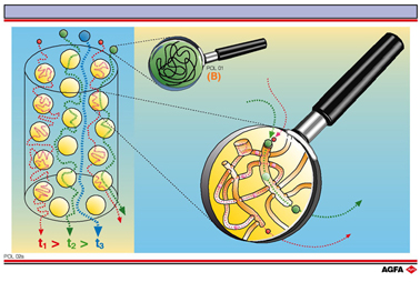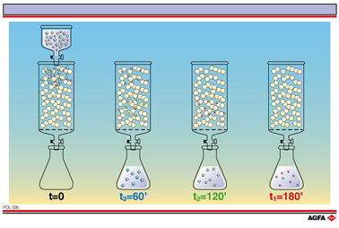 在图 POL02-a,b中,我们展示了GPC分离技术,即凝胶渗透色谱法。我们选取了含三种不同大小聚合物分子的样品,这些聚合物分子用如图POL01(2)中所示的球形颗粒(A)表示。